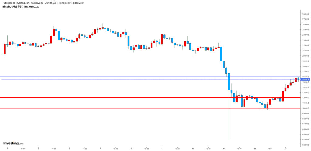 지난 한 주 급락 이후 11만 1천 달러에서 11만 6천 달러 박스권 안에서 회복을 시도하고 있습니다.