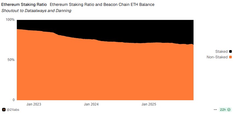 전체 발행된 이더 중 스테이킹된 비율은 장기적으로 완만히 증가세