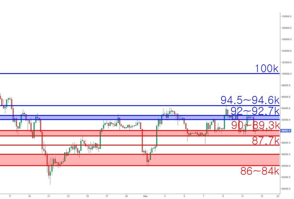 - 횡보: 89.3K는 지키지만 92.7K 못 넘으면 89~93K 박스권 지속.