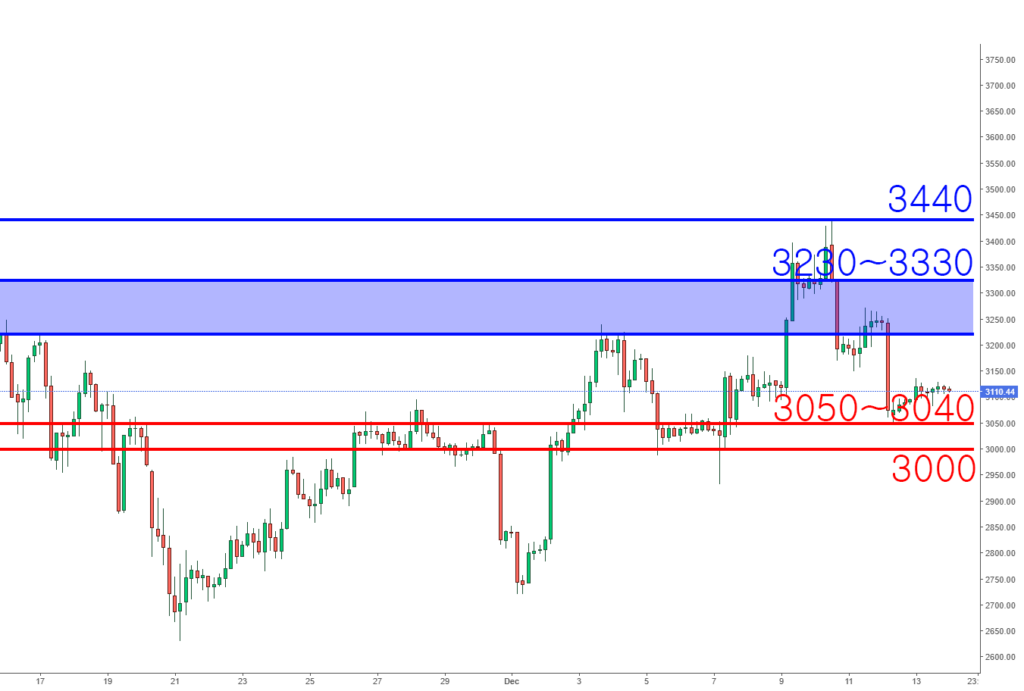 - 초반 급등(12/10 고점 3,444) → 중반 급락(3,0xx까지) → 주말 3,11x로 복귀 흐름.