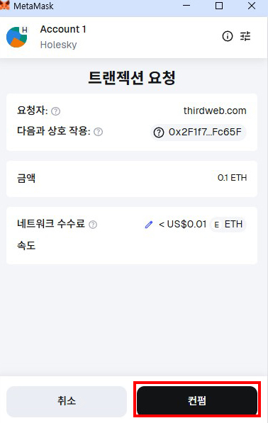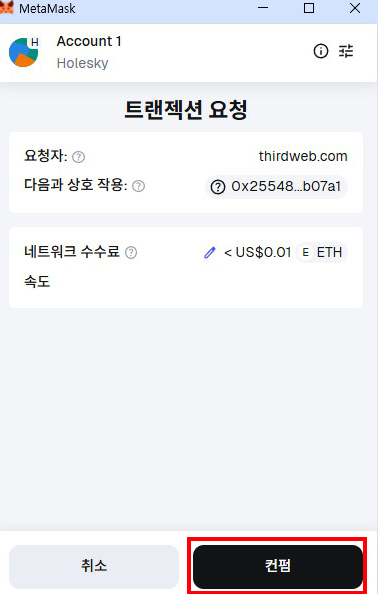 5. 메타마스크 서명 창이 뜨면 ‘컨펌’버튼을 클릭한다.