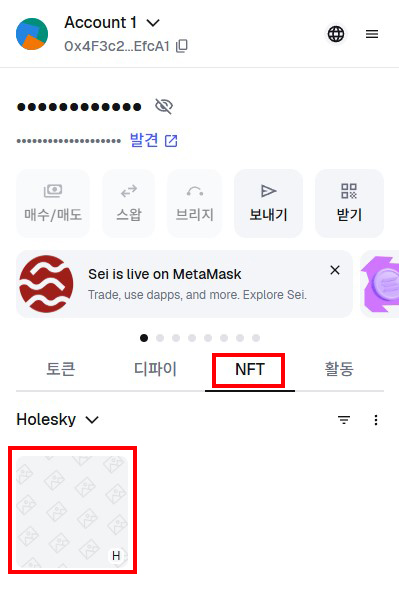 6. 메타마스크 지갑의 NFT 탭으로 이동하면, 내가 만든 NFT가 실제 자산처럼 표시된다. (경우에 따라 수초에서 수분까지 걸리기도 한다.)
