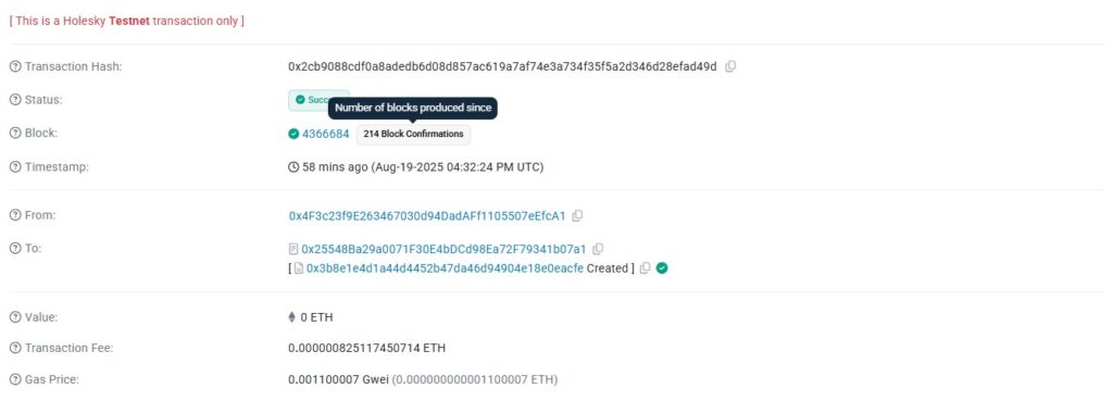Transaction Hash와 Status가 기록되어 있으며, To 항목에는 팩토리 주소가 나타난다.