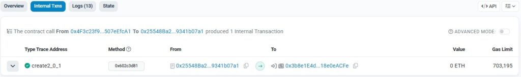 즉, 첫 번째 그림은 겉으로 드러난 컨트랙트 생성 내역을 보여주고, 두 번째 그림은 그 내부에서 실제로 create2 연산이 실행된 과정을 보여주는 것이다.