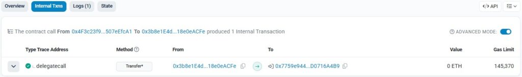 같은 트랜잭션의 Internal Txns 탭을 통해 확인한 실행 내역이다.