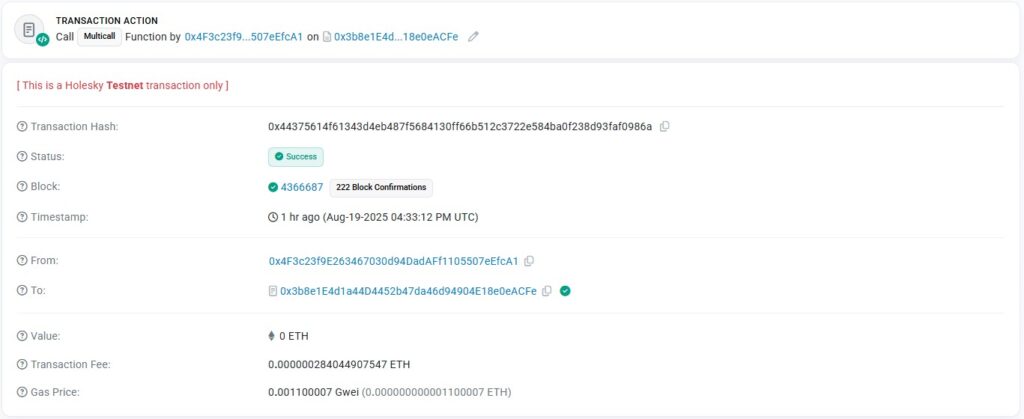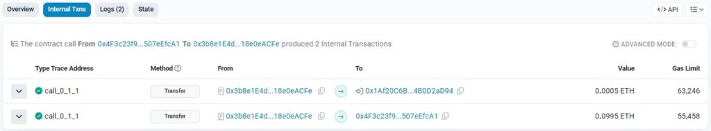 첫 번째는 0.0005 ETH가 외부 수수료 지갑으로 전송된 내역이며, 두 번째는 0.0995 ETH가 다시 사용자 지갑으로 반환된 내역이다.