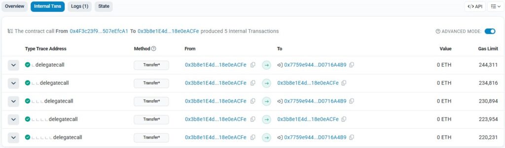 delegatecall이 연속적으로 다섯 차례 발생하였고, 각 호출마다 Transfer 이벤트가 실행되어 새로운 토큰 ID가 서로 다른 지갑으로 혹은 같은 지갑으로 순차적으로 발행되었다.