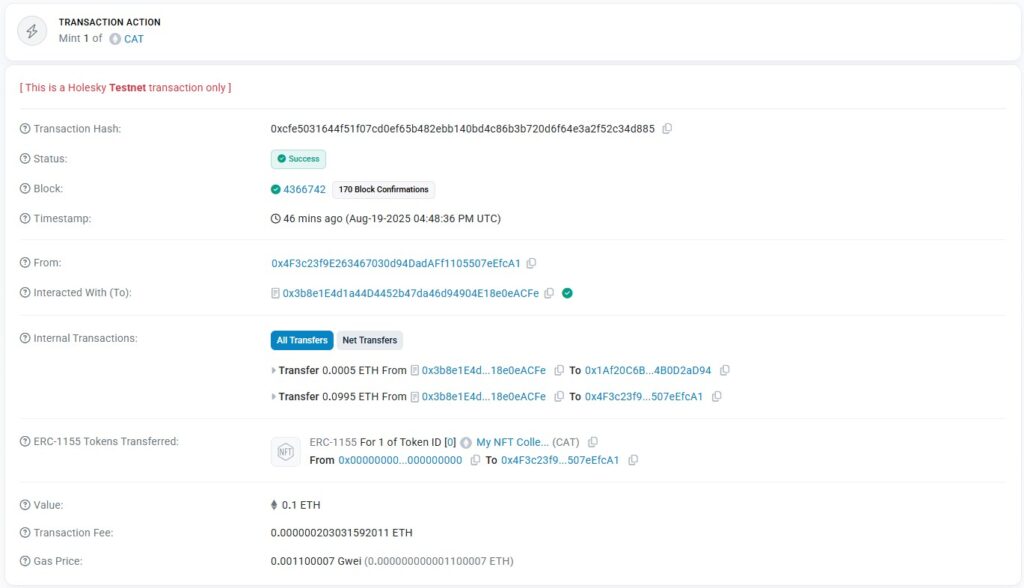 Transaction Action 항목에는 “Mint 1 of CAT”이라는 문구가 기록되어 있으며, 이는 ERC-1155 표준에 따라 특정 토큰 ID가 발행되었음을 의미한다.