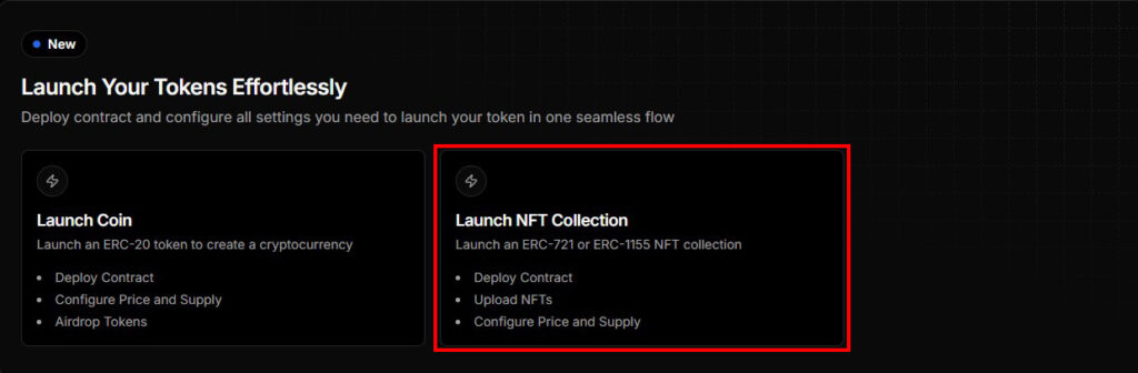 3. 두 가지 항목 중 “Launch NFT Collection”을 선택한다.