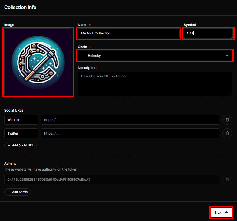 4. 그 외의 값들(Description, Social URLs 등은 필수 값이 아니므로 Skip해도 된다. 하지만 완벽한 NFT컬렉션 만들기 테스트를 해보고 싶다면 모두 입력해 보는 것이 좋다.