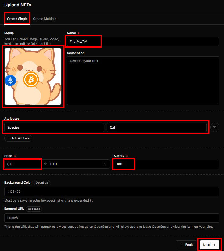 3. Attributes(속성)를 입력할 수 있다. 이는 OpenSea와 같은 마켓플레이스에서 검색될 때 쓰이는 값이다. 예: Species:Cat → 검색 시 Cat 항목으로 분류된다.
