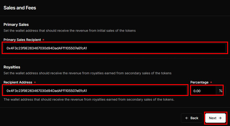 1. Primary Sales(1차 판매 수익): NFT를 처음 판매할 때 발생하는 수익으로, 기본값은 본인의 지갑 주소로 설정된다.