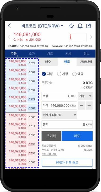 거래 화면 왼쪽에는 호가창이 있습니다.