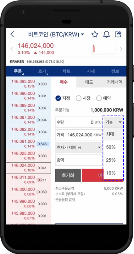 - 비율 선택 (10%, 25%, 50%): 보유 자금의 일정 비율로 매수