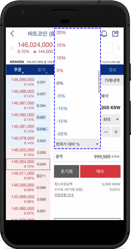 - 현재가 대비 %: 현재 가격에서 원하는 비율만큼 위/아래로 조정하여 주문