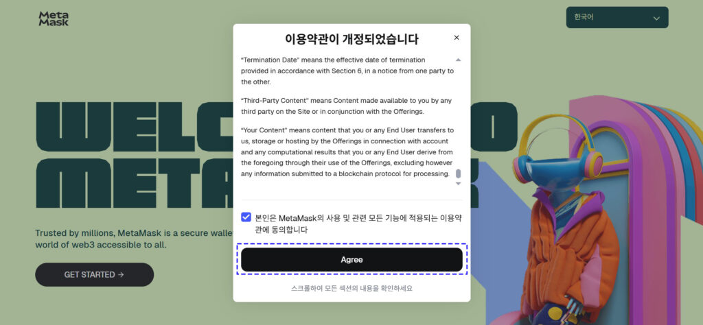 - MetaMask를 처음 실행하면 이용약관 동의 창이 나타납니다.