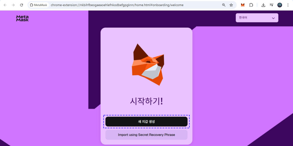 - 시작하기 화면에서 [새 지갑 생성] 버튼을 클릭합니다.