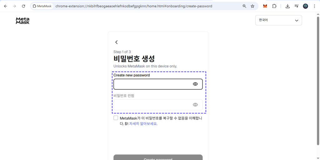 - 체크박스를 선택해 MetaMask가 비밀번호를 복구할 수 없음을 이해했다는 동의 절차를 완료합니다.