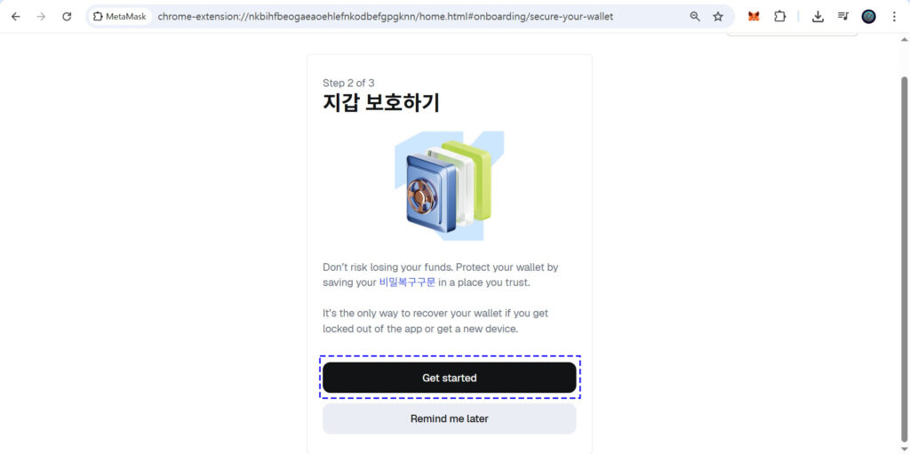 - 지갑을 안전하게 사용하려면 **비밀 복구 구문(Secret Recovery Phrase)**을 반드시 저장해야 합니다.