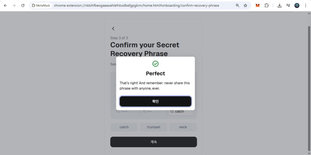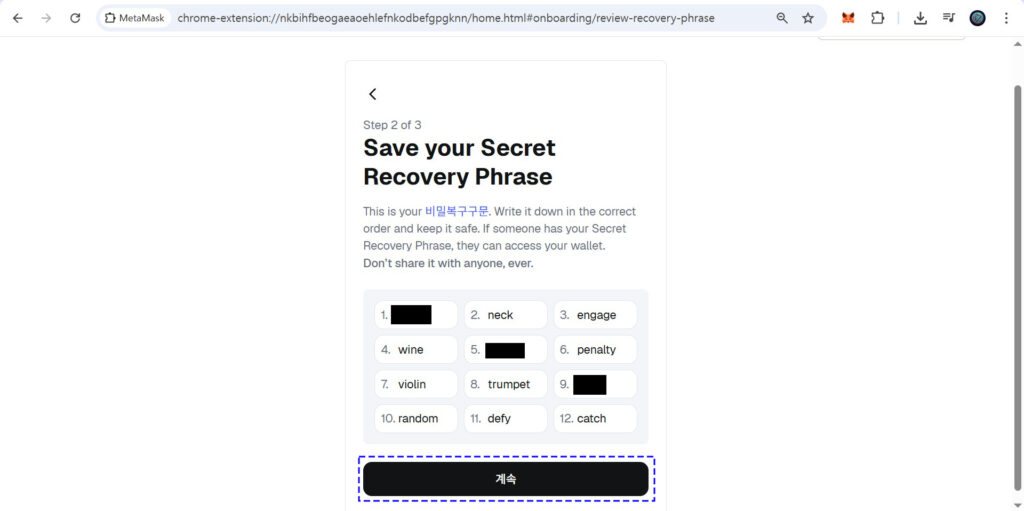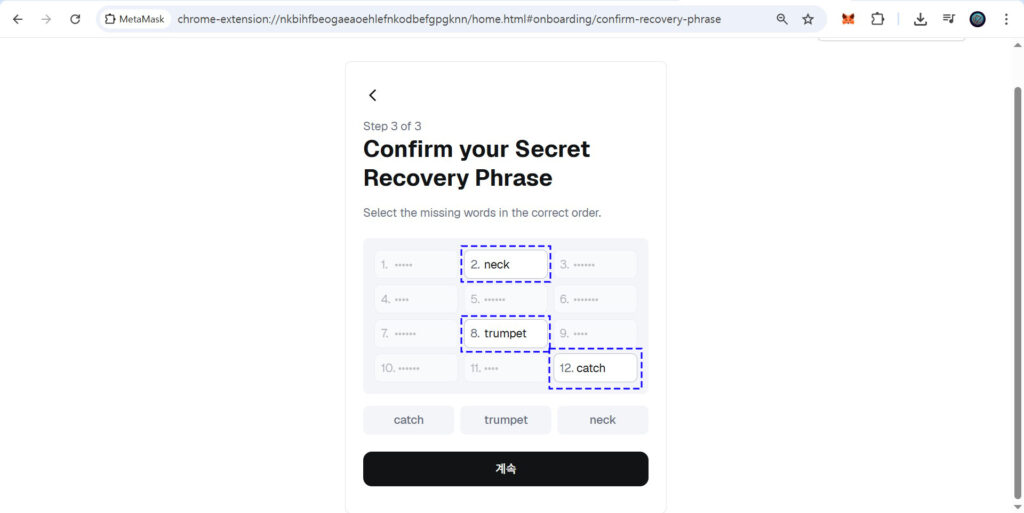- 정확히 입력해야 지갑 복구 시 문제가 발생하지 않습니다.
