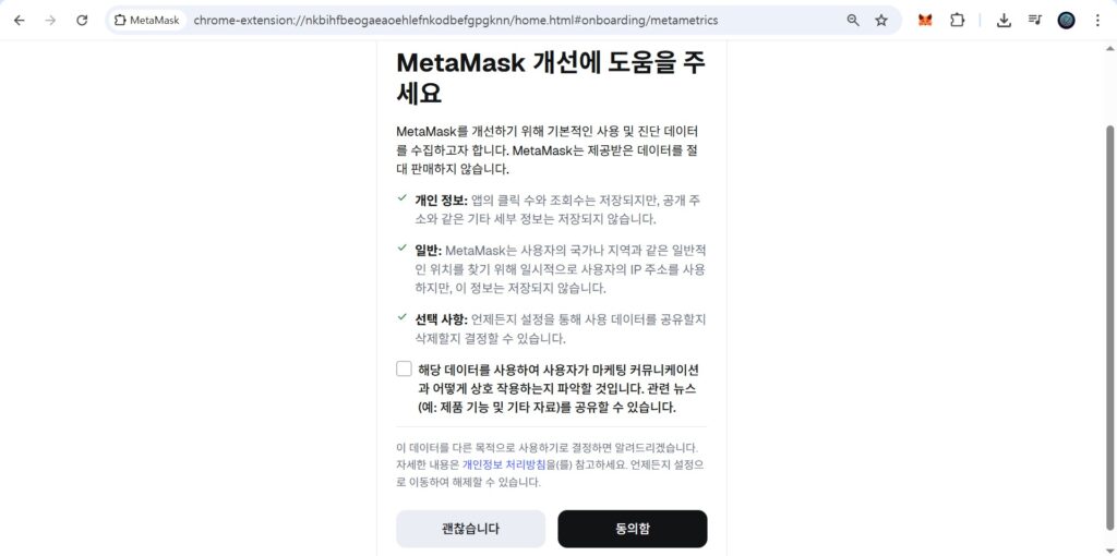 - MetaMask는 서비스 개선을 위해 기본적인 사용 데이터를 수집할 수 있습니다.