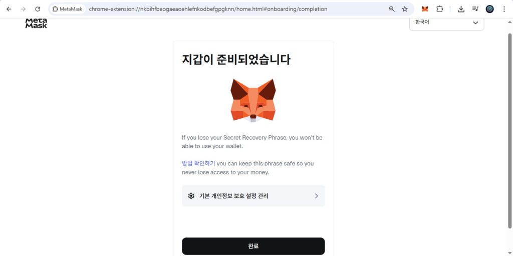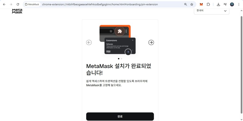 - 브라우저 확장 프로그램에서 메타마스크를 쉽게 사용할 수 있도록 [완료] 버튼을 눌러 마무리합니다.