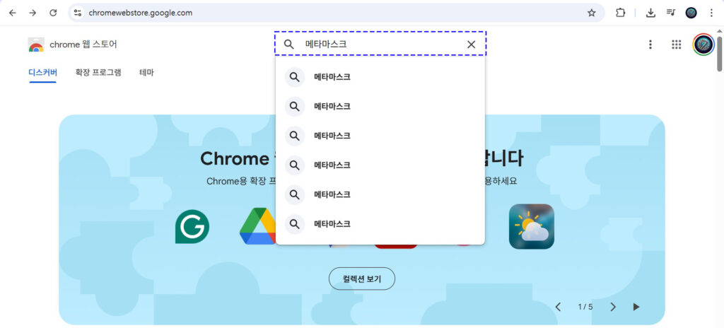 - 웹스토어 상단의 검색창에 ‘메타마스크’라고 입력합니다.