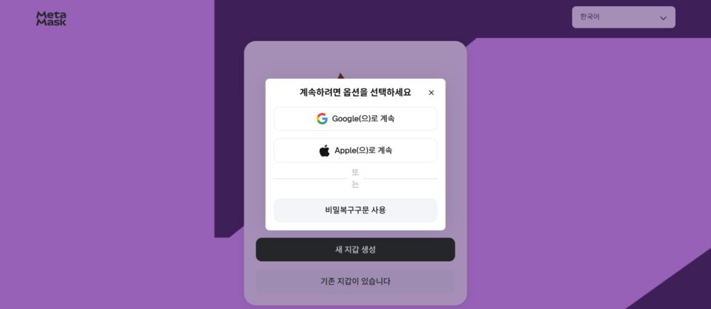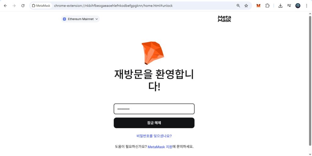 - 설치가 끝난 뒤, 메타마스크를 다시 실행하면 로그인 화면이 나타납니다.