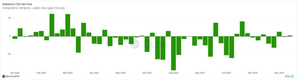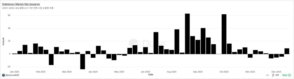 - 스테이블코인 순발행이 플러스로 누적되는지(유동성 재가속),